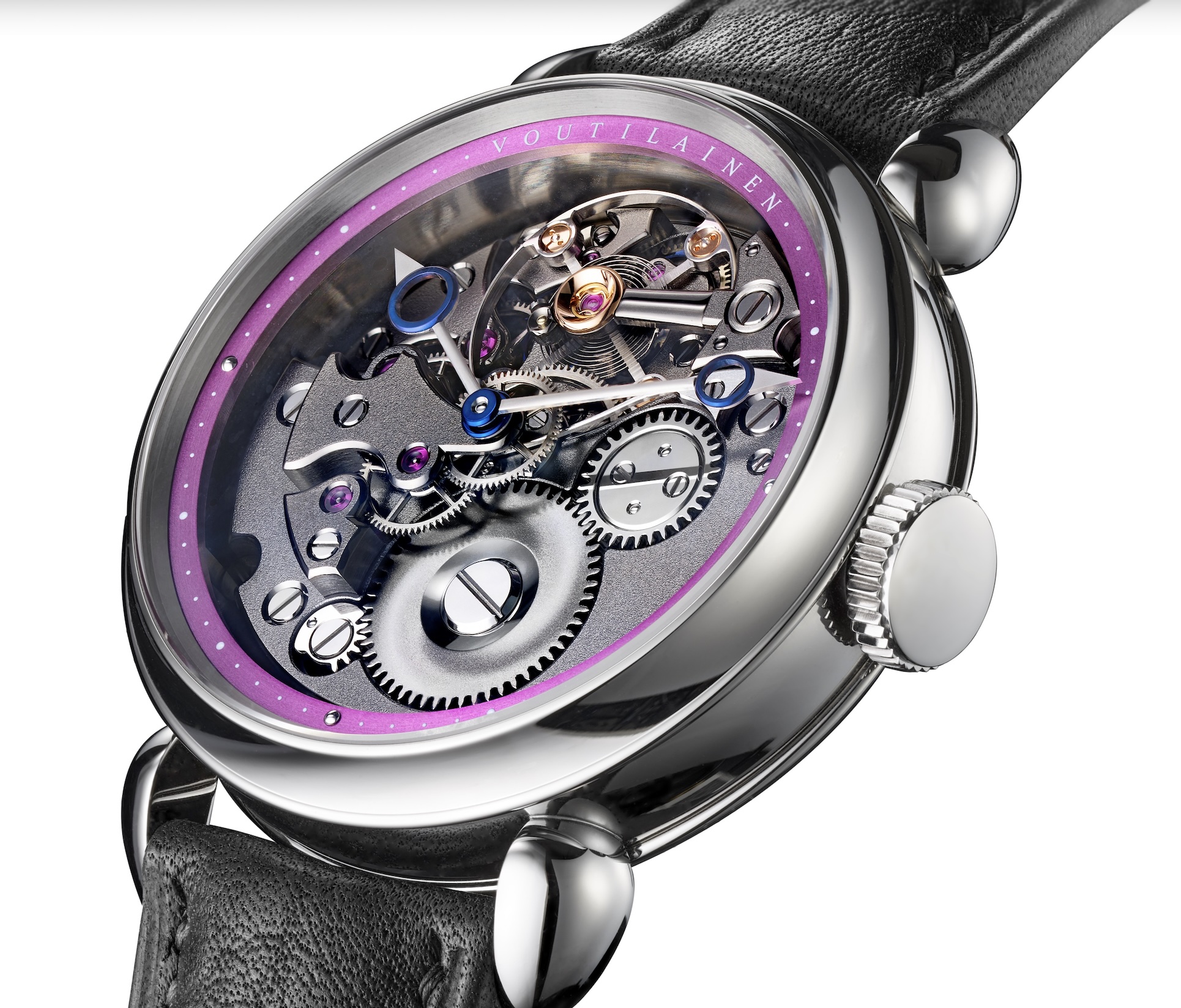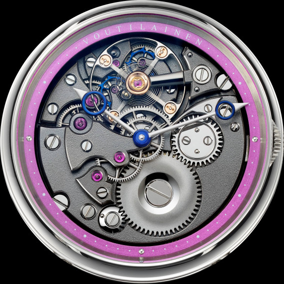 En termes de technique, le calibre présente un balancier très large manufacturé en interne, assurant une régulation parfaite dans des tolérances strictes. Afin d’équiper un tel garde-temps, un système rare et unique de spiral a été utilisé. La partie extérieure du spiral utilise une courbe Phillips typique, tandis que la courbe intérieure utilise la courbe Grossmann, moins connue, augmentant ainsi encore plus la précision. Le mouvement est particulièrement remarquable en raison de ses deux roues d'échappement, qui fournissent une impulsion directe au balancier à travers le plateau d’impulsion et sa levée. Cette construction innovante améliore l'efficacité en nécessitant moins d'énergie que l'échappement à ancre suisse et permet d'obtenir des bénéfices notables pour un usage quotidien, en termes de longévité, de stabilité et de réserve de marche plus longue. Grâce au mécanisme inversé, il est possible d'admirer le mouvement qui est minutieusement fini selon les standards les plus élevés par les artisans experts de l’atelier Voutilainen. Les surfaces des pignons et des roues sont complètement plates et polies a vec des tolérances exceptionnellement uniformes. La platine et les ponts, fabriqués en maillechort, sont décorés à la main pour atteindre les plus hauts niveaux de finition de surface. Les vis et toutes les pièces en acier sont également finies et polies à la main. Pour compléter l’esthétique, le mouvement est abrité dans une boite élégante et raffinée de 39 mm en titane, associée à un bracelet noir en veau cousu-main.