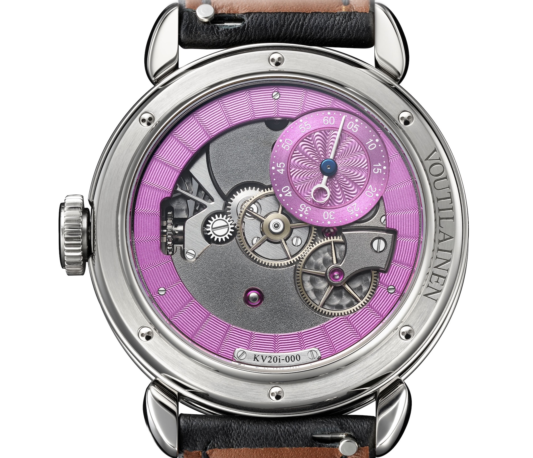 La montre Voutilainen KV20i Inversé incarne parfaitement la philosophie de Kari Voutilainen, alliant respect de la longévité et de la précision à la tradition horlogère classique. Repoussant les limites de l'horlogerie, ce garde-temps est doté d'un nouveau calibre manufacturé présentant une construction unique inversée, permettant d'admirer, côté cadran, sa beauté et sa technicité tout en lisant l'heure. Affichant une esthétique contemporaine, le KV20i se distingue par un élégant cercledes minutes de teinte pourpre associé à une boite en titane. Le mécanisme du KV20i a été conçu, fabriqué, fini et assemblé dans l’atelier Voutilainen. Grâce à l'architecture innovante, la montre offre l'opportunité d'admirer chaque détail du mouvement, notamment l’élégant pont de balancier à un seul bras ainsi que le balancier oscillant à une fréquence traditionnelle. De plus, elle permet aux passionnés d'apprécier d'un seul coup d'œil les mouvements synchronisés des roues d'échappement. Sur le fond du boîtier, un cadran et un compteur de secondes pourpre sont guillochés main ajoutant une touche d’élégance.