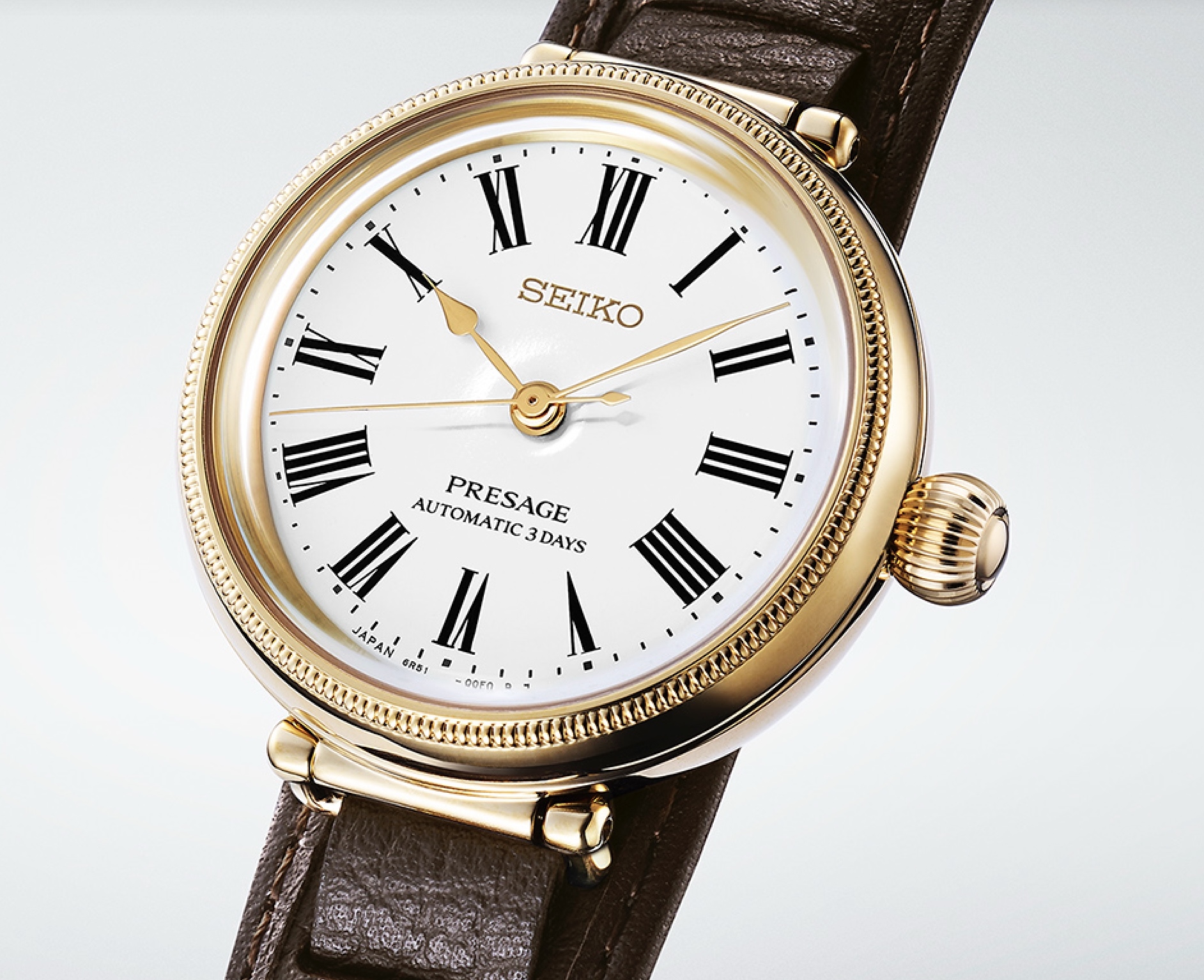 UN COMMENTAIRE ? Le cadran de ce boîtier de 35 mm x 12,3 mm d’épaisseur, étanche à 50 m et animé par un mouvement à remontage automatique disposant de trois jours de réserve de marche (72 heures), a tout d’une montre de poche, mais c’est au poignet qu’on l’accroche, alors que la montre est proposée en série limitée de 1 450 pièces (gravées au dos des marquages du 145e anniversaire de Seiko) aux alentours des 2 000 euros. Un chef-d’œuvre de néo-classicisme qui est en même temps un hommage à la tradition des premières montres de poche Seiko diffusées sur le marché japonais…