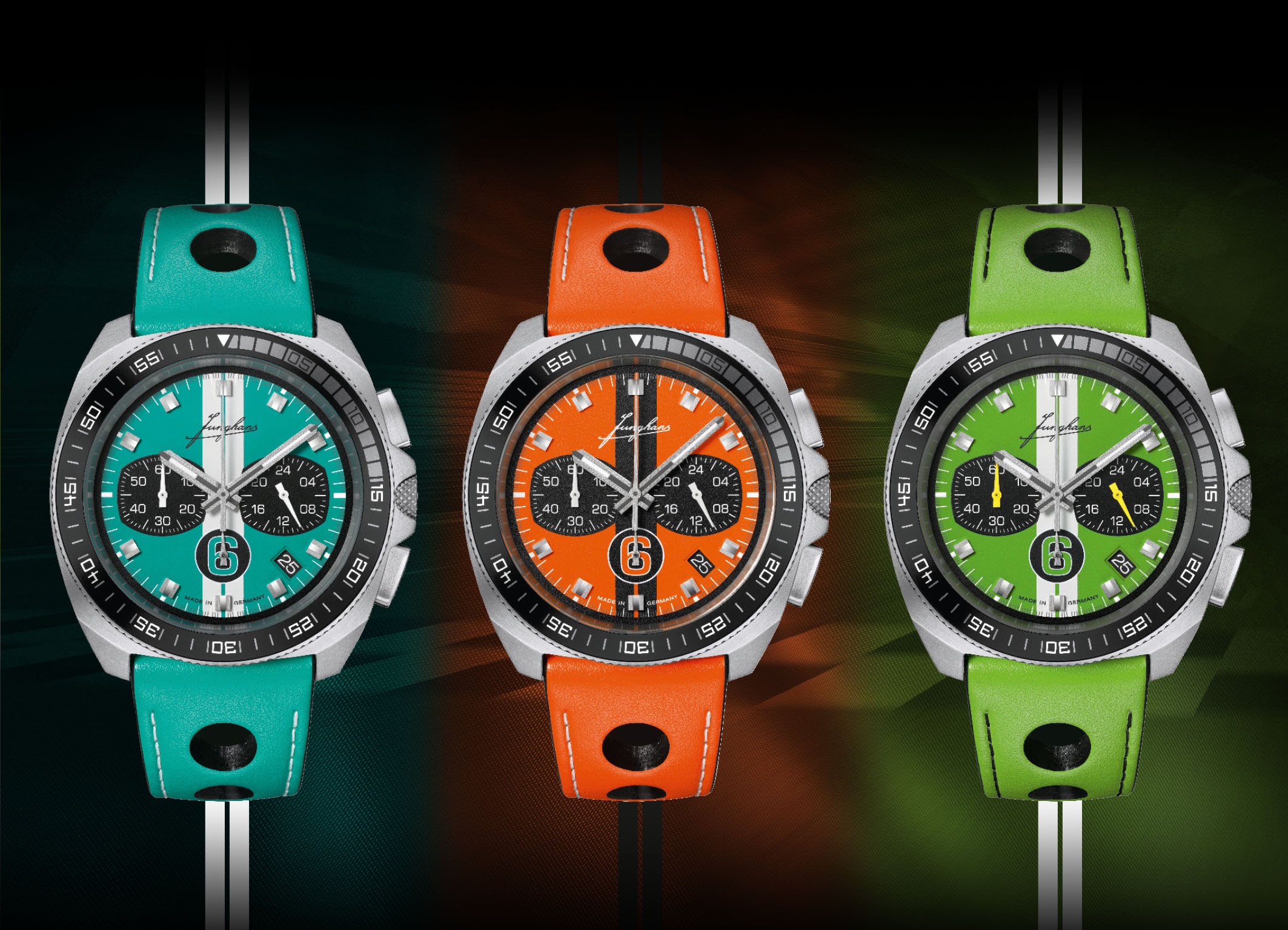 Le gris, c‘était hier. Couleur orange, turquoise ou vert clair - c‘est ainsi que Junghans fait briller les cadrans de la nouvelle 1972 Chronoscope Sports Edition 2026 : trois couleurs, trois montres et seulement 200 exemplaires chacune. Ces garde-temps sportifs ettendance offrent un départ parfait pour la nouvelle année. Soyez rapide : la 1972 Chronoscope Sports Edition 2026 est une édition strictement limitée. Après 2024 et 2025, elle est la troisième et la plus remarquable de cette série. À son côté sportif s‘ajoute un visuel haut de gamme avec un boîtier au design marquant et de nombreux détails raffinés, par exemple la lunette rotative dans le sens horaire inverse ou encore la couronne et les poussoirs qui reprennent la ligne du boîtier. Les cadrans présentent une finition mate et une double bande centrale de couleurassortie. Les versions bleue et verte du cadran reçoivent des doubles bandes dynamiques blanches au centre, tandis que sur la version orange, la double bande longitudinale est peinte en noir. Tous les cadrans affichent le chiffre 6 sous la forme d‘un numéro de départ à la position appropriée. Le logo historique sur le cadran rappelle l‘attachement traditionnel de Junghans au sport automobile historique. Cela se voit aussi dans la conception des lanières de cuir de couleur assortie, qui sont perforées dans le style des gants pour pilote de course traditionnels.