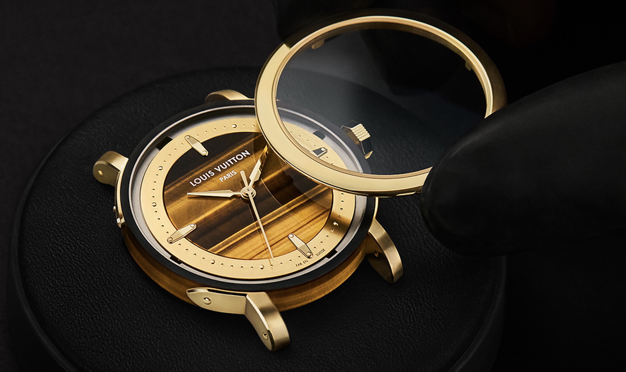 Le design de l’Escale, inspiré des malles Louis Vuitton, se prête parfaitement à ce voyage thématique à travers la texture et la luminosité. Avec l’œil-de-tigre, la collection poursuit sa découverte des trésors de la terre — de la turquoise aux veines délicates, à la malachite aux bandes subtiles, et désormais, l’œil-de-tigre, dont l’éclat ambré évoque les tons vifs d’un crépuscule dans la savane. Dans de nombreuses cultures ancestrales, l’œil-de-tigre était considéré comme un talisman protecteur chassant le mal, faisant de cette pierre le parfait compagnon d’un voyage vers l’inconnu. La création d’un boîtier taillé dans un seul bloc de pierre, introduite par Louis Vuitton avec le lancement de l’Escale Turquoise et Malachite, reste une prouesse des plus complexes dans l’univers horloger. C'est à La Fabrique des Boîtiers, la structure de fabrication de boîtiers haut de gamme de La Fabrique du Temps Louis Vuitton, que les ingénieurs et artisans ont innové en réécrivant les règles de l’usinage, pour s’adapter aux caractéristiques uniques de l’œil-de-tigre. Sa structure interne, dense et fibreuse, exige un travail d’une immense précision. Cette pierre dure est parsemée d’étroites zones très délicates ; l’artisan doit donc déployer tout son savoir-faire pour la sculpter sans risquer de la fissurer. Chaque anneau est taillé en suivant des tolérances d’une précision microscopique, avant d’être polie à la main pour révéler son éclat caractéristique. Comme pour les modèles en turquoise et en malachite,la géométrie du boîtier a été entièrement repensée pour l’Escale Œil-De-Tigre, afin de garantir son intégrité sans compromettre les contours harmonieux emblématiques de la collection. Le regard, l’intuition, la sensibilité humaine jouent un rôle essentiel à chaque étape de fabrication, pour repérer le sens des fibres, éviter les inclusions naturelles susceptibles de fragiliser la pierre et s’adapter à ses réactionsimprévisibles. Enfin, l’assemblage du cadran et du boîtier exige à son tour une grande virtuosité. Chaque composant est évalué selon son harmonie chromatique, l’orientation des bandes et le rythme visuel avant l’assemblage. Le choix final est laissé à l’appréciation de l’artisan, qui associe chaque cadran à une carrure lors d’un processus mêlant observation, ajustement et intuition. Chaque montre est donc une pièce unique, le fruit d’un dialogue éphémère entre motifs naturels et savoir-faire artisanal.