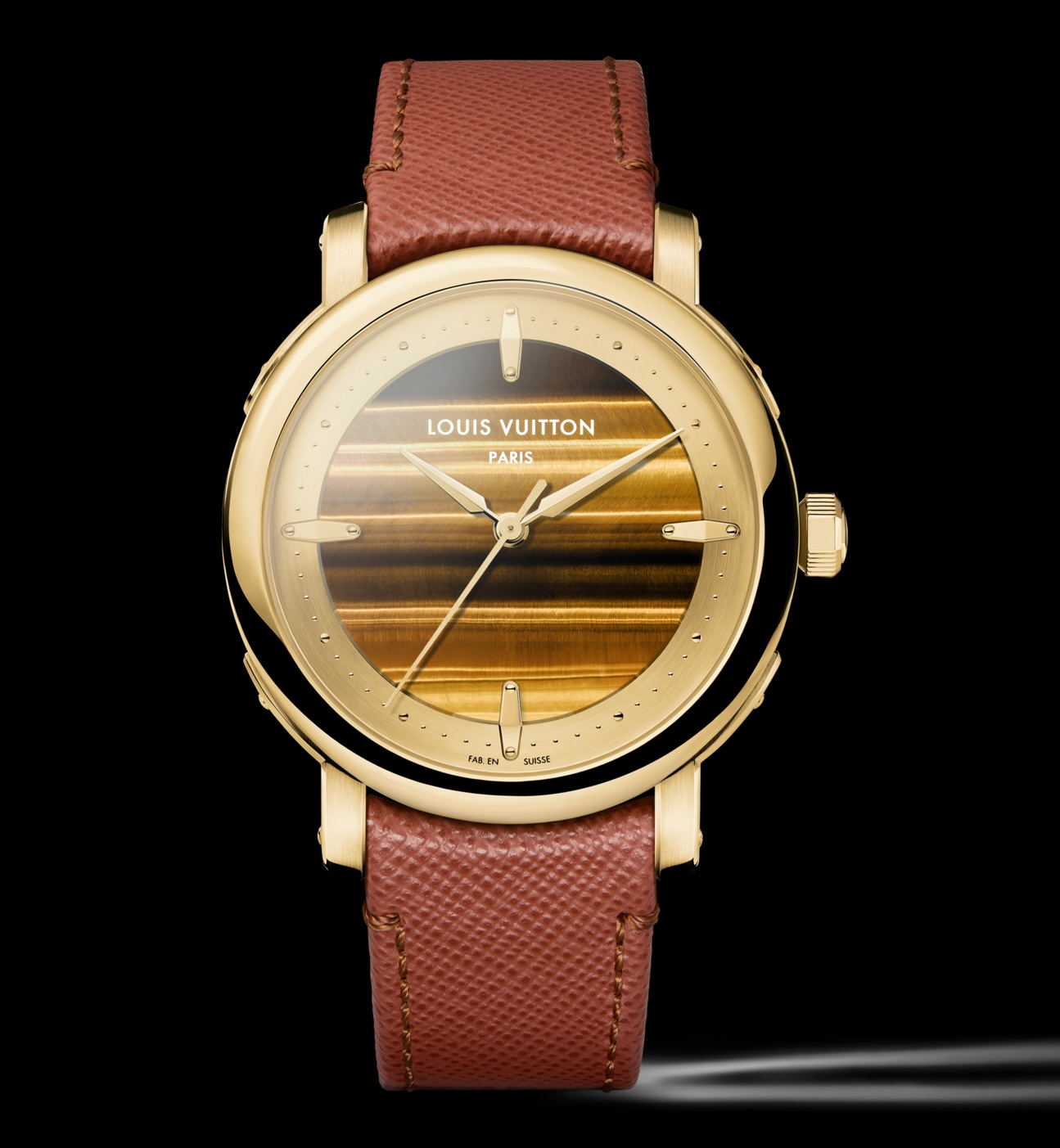 Louis Vuitton continue de repousser les frontières du travail de la pierre ornementale en horlogerie, à travers un nouveau garde-temps, limité à 30 exemplaires : l’Escale Œil-De-Tigre. Après le lancement en 2025 de deux modèles en platine, ornés de turquoise et de malachite, cette nouvelle création apporte une nouvelle dimension inédite à l’exploration par la Maison du savoir-faire artisanal et des splendeurs de la nature tout en évoquant le romantisme de l’Art du Voyage si cher à la Maison. Le boîtier de 40 mm reflète l’architecture distinctive de la collection Escale, inspirée du savoir-faire malletier et désormais sculptéà travers un anneau en œil-de-tigre, taillé d’un seul bloc homogène, entourant un cadran façonné dans la même pierre ornementale. Les cornes, la lunette, le fond de boîte et la couronne sont en or jaune, première apparition de ce métal noble dans la collection Louis Vuitton Escale. Le résultat final est l’alliance éclatante du minéral et du métal,les tons chauds de la pierre étant rehaussés par la lueur de l’or précieux. L’œil-de-tigre, prisée depuis l’Antiquité pour ses fascinantesteintes brun-doré, vient enrichir l’Escale d’une nouvelle profondeur chromatique. Ses bandes fibreuses ocre, bronze et terre de Sienne scintillent d’une vitalité optique, évoquant les ondulations de la lumière dans le désert, ou le grain d’un bois brûlé par le soleil. Son aspectremarquable vient de son processus de création géologique : sous l’effet de la chaleur et de la pression, les éléments bruts fusionnent et se métamorphosent en minerais d’une beauté rare. Chacune des pierres destinées à la fabrication d’un garde-temps Louis Vuitton Escale ornée d’œil-de-tigre est minutieusement sélectionnée pour l’équilibre de ses nuances et de son mouvement, ses bandes chatoyantes formant un jeu complexe de lumière et de matière.