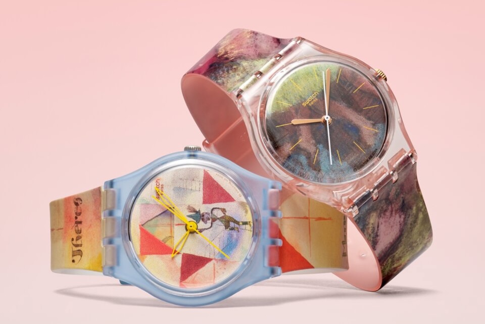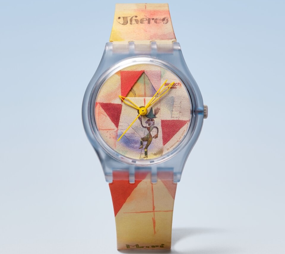 Klee Bavarian Don Giovanni présente la géométrie ludique et les formes symboliques de l’œuvre The Bavarian Don Giovanni (1919) de Paul Klee. Considéré comme un autoportrait voilé de l’artiste, ce tableau met en scène un personnage grimpant une échelle parmi les noms de cinq femmes. Cette composition aux lignes fantaisistes et à la palette éclatante prend vie sur la montre : le personnage de Klee figure sur le cadran, encadré par des noms féminins sur le bracelet. Elle devient ainsi une ode au drame, à la créativité et à la liberté artistique, à porter au poignet. Son cadran possède une roue de calendrier originale dont la fenêtre change de couleur chaque jour – peut-être une allusion à l’aveu de Klee selon lequel ses « coups de coeur variaient avec chaque soubrette de l’opéra ». « Nous sommes immensément fiers de notre collaboration avec le Guggenheim, qui marque un jalon dans l’histoire du Swatch Art Journey. Avec la collection Swatch × Guggenheim, nous célébrons non seulement la passion de Swatch pour les arts, mais aussi notre relation de longue date avec le musée Guggenheim de New York et la collection Peggy Guggenheim à Venise. Des années d’événements mémorables et de collaborations inspirantes avec ces deux institutions artistiques majeures ont abouti à un moment d’exception : quatre chefs-d’œuvre, soigneusement triés sur le volet par les équipes curatoriales et réinterprétés par Swatch comme autant d’“œuvres d’art à glisser au poignet”. Ensemble, le Guggenheim et Swatch franchissent une étape significative pour rendre l’art plus proche des gens, dans le monde entier » (Carlo Giordanetti, membre de la direction de Swatch AG et CEO du Swatch Art Peace Hotel)…