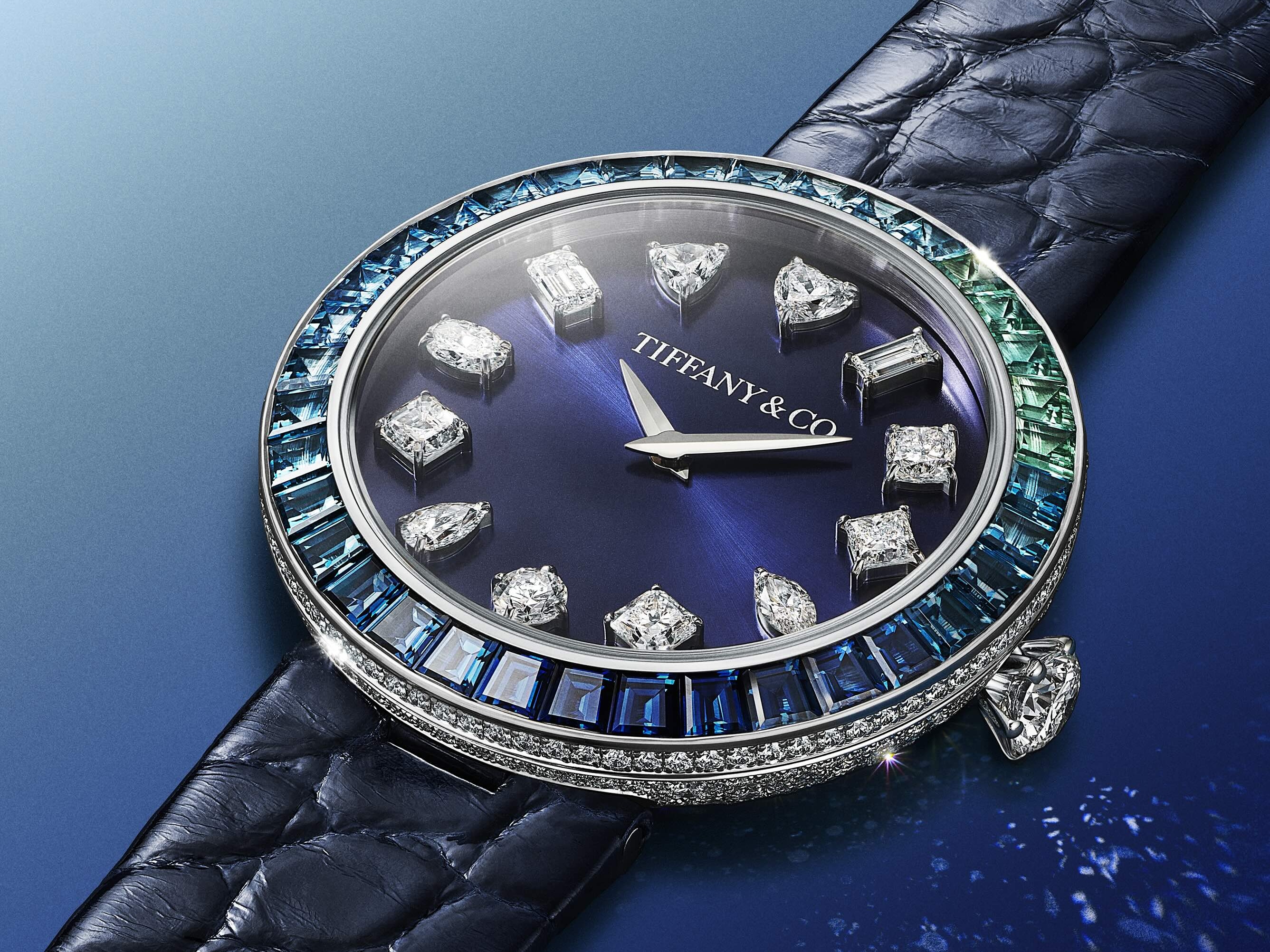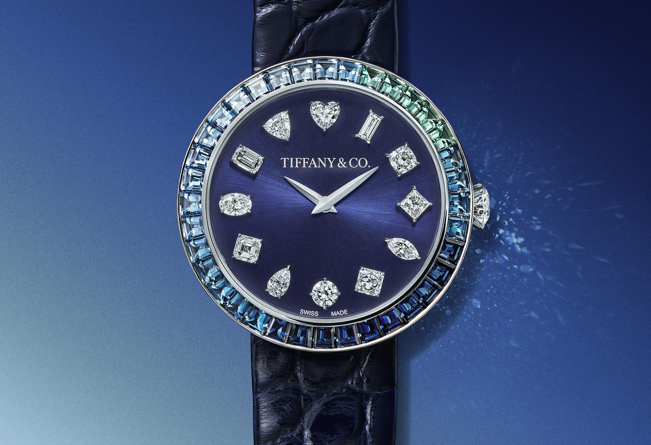 UN COMMENTAIRE ? Le savoir-faire de Tiffany & Co. est légendaire pour tout ce qui concerne la joaillerie, les diamants et les pierres de couleur. Il est encore plus démonstratif de voir cet art joaillier déployé dans une montre, exercice difficile tellement l’horlogerie impose de contraintes créatives. Les prix ne sont pas encore fixés pour ce boîtier en or de 36 mm serti d’un total de 556 diamants (poids d’environ 4 carats) de diférentes tailles, accompagnés de saphirs, de topazes et d’émeraudes (poids total : 5 carats), avec un mouvement automatique suisse disposant de 38 heures de réserve de marche.