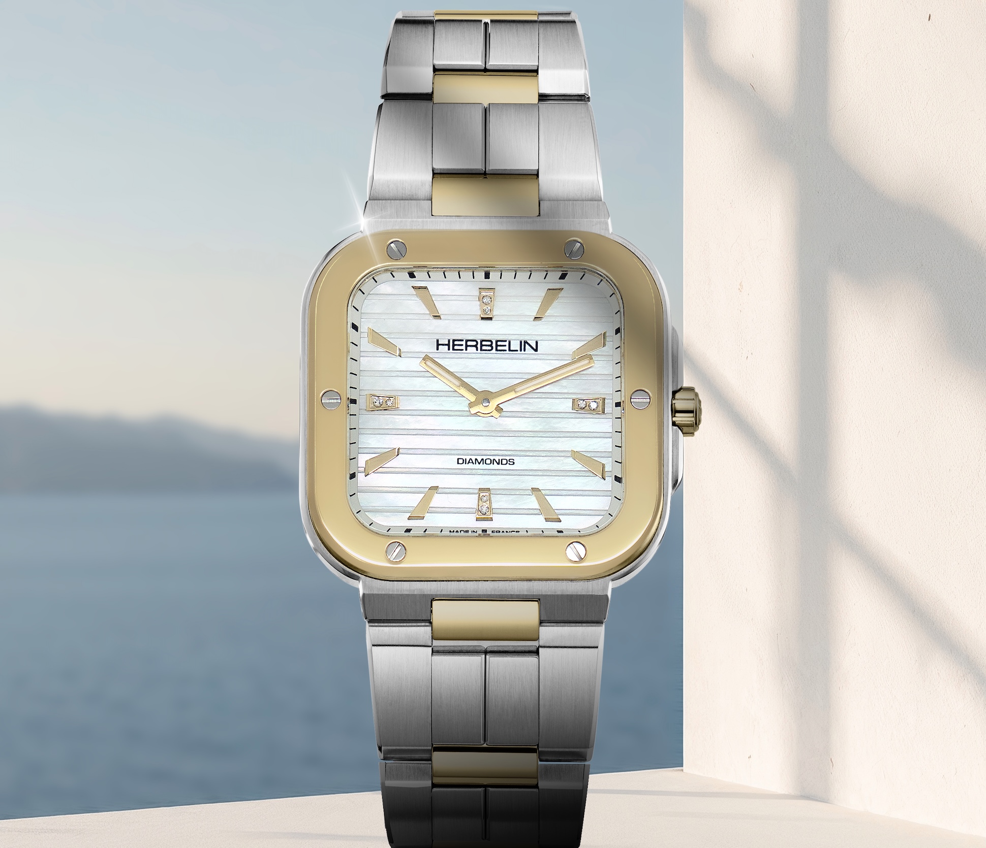 Déclinée en deux versions, Cap Camarat Square Quartz conjugueélégance et modernité. Avec son boîtier carré de 30 mm et son cadran en nacre naturelle, elle capte la lumière avec délicatesse. Les diamants véritables, sertis à 3h, 6h, 9h et 12h, apportent une touche de raffinement et de prestige. La version FKM blanche révèle un boîtier entièrement traité en PVD or jaune 1N, affirmant une allure dynamique et élégante. La version acier bicolore associe un boîtier en acier 316L à une lunette en PVD or jaune, offrant un raffinement subtil et un équilibreparfait. Sublimé par ses index rivetés et sertis de diamants, le cadran nacré aux reflets uniques se distingue par son élégance et son raffinement. Protégée par une glace saphir inrayable et étanche à 100 mètres, cette montre accompagne toutes les activités de la femme contemporaine, du quotidien aux moments d’exception. Alliance parfaite de modernité et de sophistication, Cap Camarat Square Quartz se distingue par son style épuré et ses finitions délicates. Une montre de caractère qui illustre l’art horloger Herbelin, entre modernité et héritage, et incarne la vision contemporaine du sport-chic féminin.