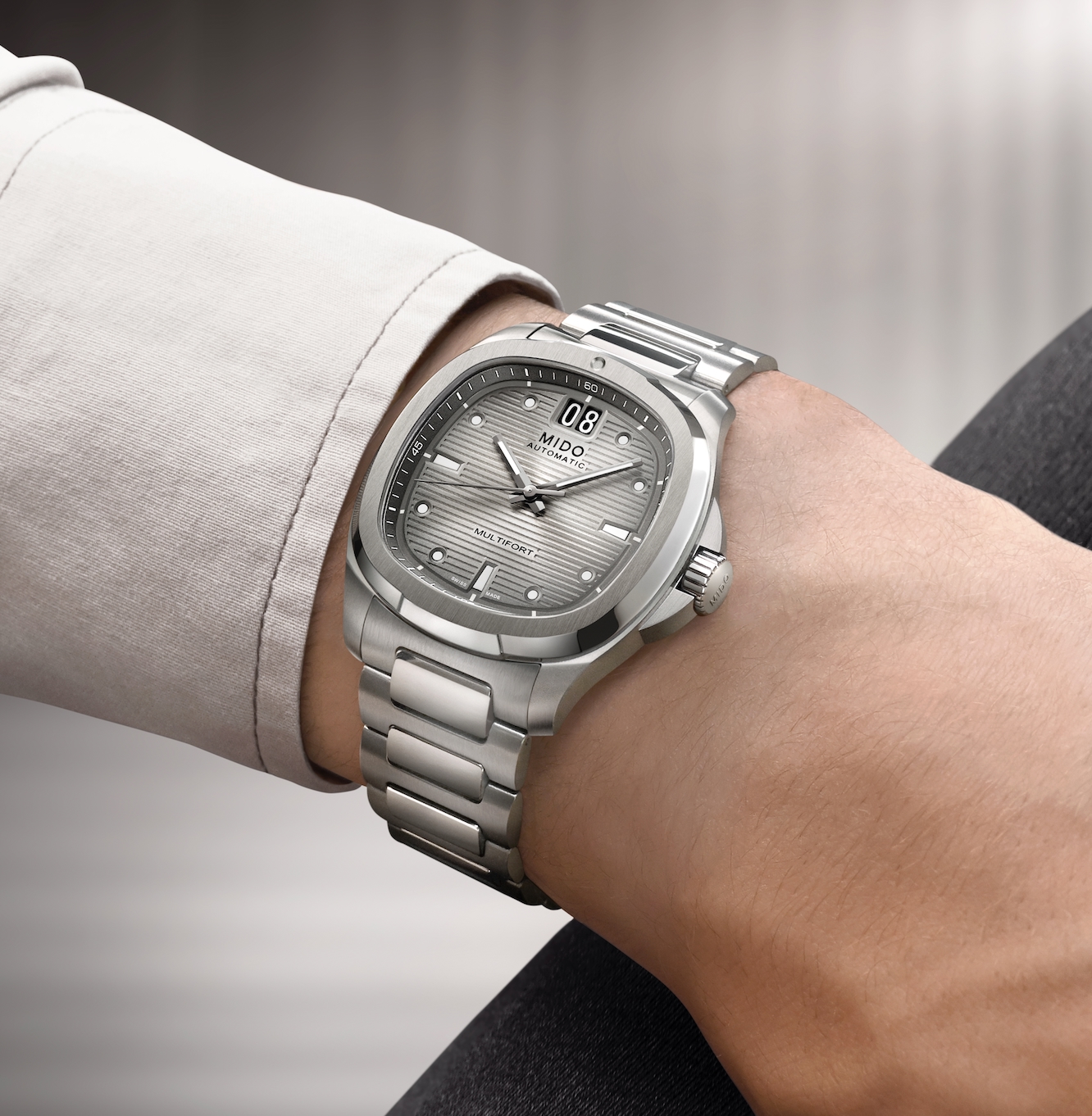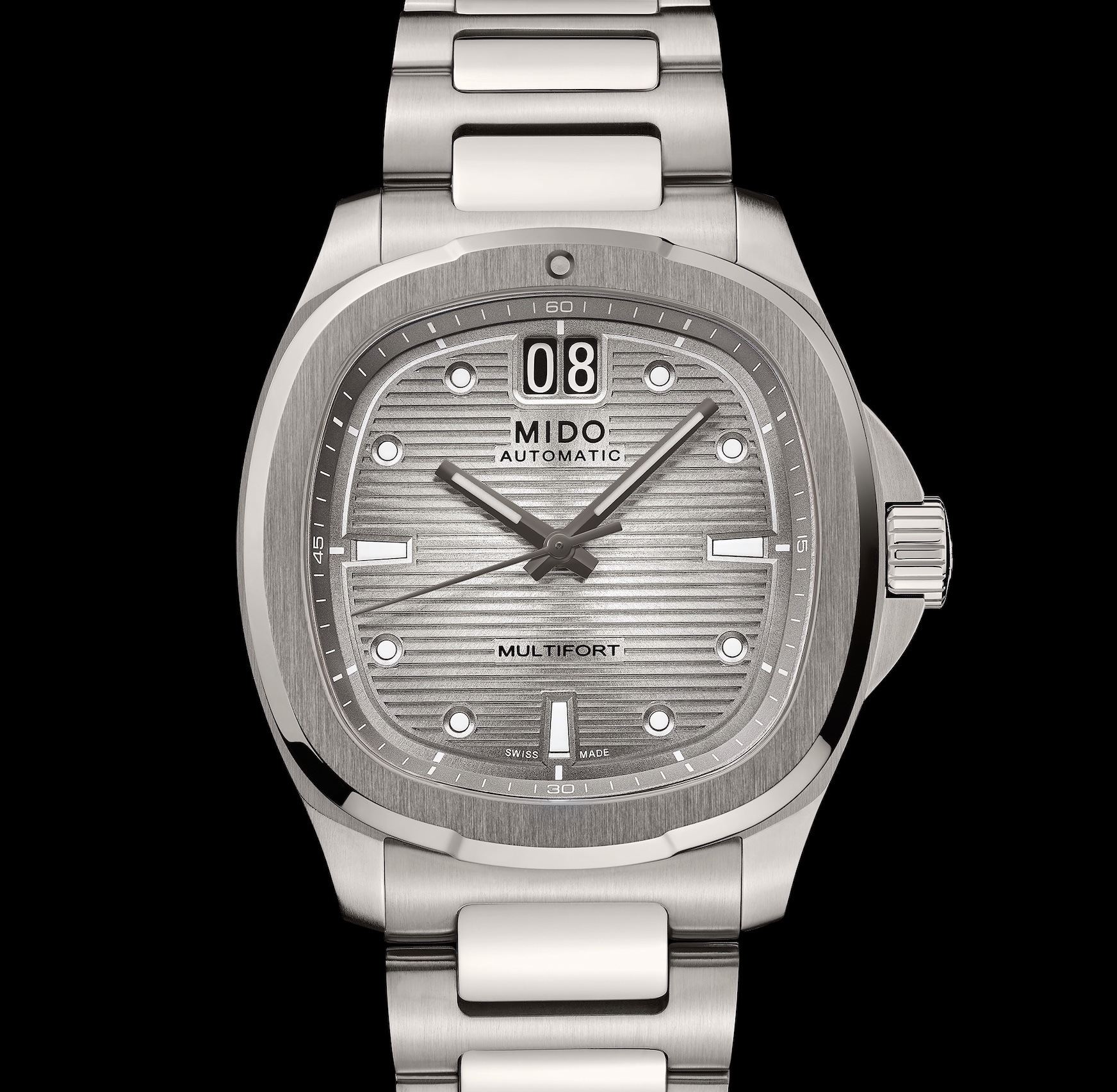 Sur le plan esthétique, la montre joue avec subtilité sur les variations de gris et de textures. Souligné par la lunette polie, satinée sur le dessus, met en valeur un cadran dégradé gris satiné soleil est traversé de lignes horizontales en relief, renforçant les variations de surfaces. Les index, creusés et garnis de Super-LumiNova blanc, tout comme les aiguilles nickelées noir, facettées et diamantées, assurent une lisibilité optimale de jour comme de nuit. À midi, la grande date s’impose, parfaitement lisible en blanc sur fond noir, surmontée par un repère sablé sur la lunette. Satiné sur les grandes surfaces, le boîtier de 40 mm x 39,2 mm capte la lumière tout en discrétion. Le bracelet, réalisé en titane et aux maillons centraux polis, tient lui aussi cette promesse de durabilité et de confort tout en légèreté. Son maintien sur le poignet est irréprochable grâce à une boucle déployante actionnée par boutons-poussoirs. La Multifort TV Big Date Titanium s’adresse aux amateurs de montres capables de tout affronter – tout comme le Calibre 80. Visible par le fond transparent, ce cœur mécanique de haut vol bat avec une régularité éprouvée, grâce à son spiral en Nivachron. Cet alliage de pointe a été conçu pour résister aux champs magnétiques et aux variations de température. La fiabilité du mouvement bénéficie de plus d’une enviable réserve de marche allant jusqu’à 80 heures. La masse oscillante révèle un décor de Côtes de Genève, ainsi que le logo Mido gravé – clin d’œil à l’expertise horlogère de la marque, fondée en 1918. Étanche jusqu’à une pression de 10 bars (100 m / 330 ft), ce garde-temps est aussi fiable qu’élégant. Dans cette version tout titane, la Multifort TV Big Date associe robustesse, confort et esthétique sportive. Une montre de caractère, pensée pour traverser le temps avec légèreté.