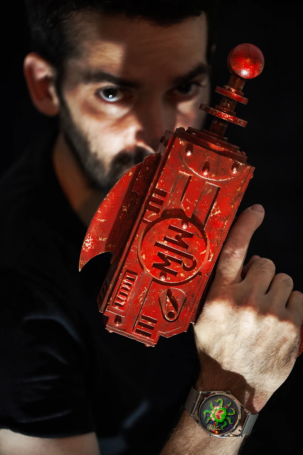 Démarquez-vous de la foule avec cette montre à monstre qui interpelle. Conçu par l'artiste et concepteur de personnages Onorio D'Epiro (ci-dessus), Monster Melter 3000 montre un homme spatial enfermé dans un combat mortel avec un extraterrestre terrifiant mangeur d'hommes. Armé de son puissant pistolet à rayons, va-t-ilvaincre le monstre ? Cette montre ludique est un hommage aux films descience-fiction et à la bataille épique entre l'extraterrestre et l'homme spatial. Le design est imprimé dans des pigments néon vifs qui reflètent l'origine d'un autre monde du monstre. Comment lire l'heure ? La position du pistolet à rayons de l'homme spatial indique les minutes. Le tentacule coupé du monstre vous montre l'heure. Chaque couleur que vous voyez dans le design a été mélangée à la main, avant d'être aérographe et imprimée couche par couche et assemblée par notre équipe d'atelier dédiée ici à Londres. Onorio (explique son inspiration de conception pour Monster Melter 3000 : « J'ai toujours aimé les films de science-fiction tels que Alien, Blade Runner et 2001. Je voulais donc vraiment concevoir une montre qui rende hommage à ce genre au cinéma. La bataille finale dans Aliens m'a toujours marqué comme un moment vraiment cool et je l'ai utilisé comme source d'inspiration, mais avec ma propre touche ludique. Je veux dire, qui n'aime pas un monstre tentaculaire baveux avec 30 yeux ! Mon objectif principal est de concevoir une montre amusante qui vous fasse sourire chaque fois que vous regardez votre poignet. »