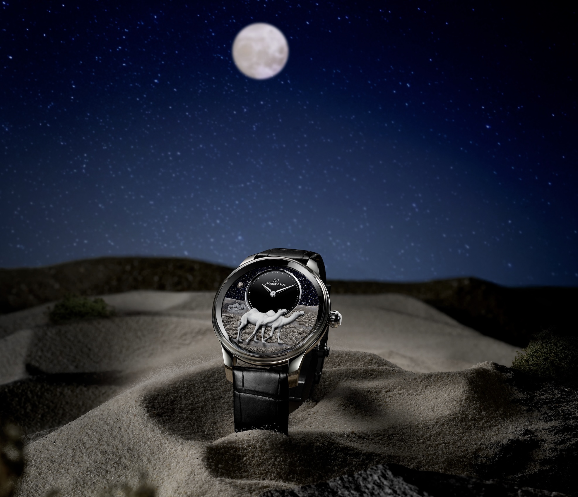 UN COMMENTAIRE ? il faudra féliciter le rédacteur de service pour la redoutable concision de sa présentation – officielle et définitive, si, si ! – de cette pièce unique de 41 mm, exécutée dans un goût orientalisant qui ne doit pas laisser penser que la maison Jaquet Droz vient d’entamer une longue traversée du désert. On appréciera comme il se doit le minimalisme allégorique du bac à sable dans lequel cette montre a été plantée sur l’image ci-dessous : pauvres camélidés !