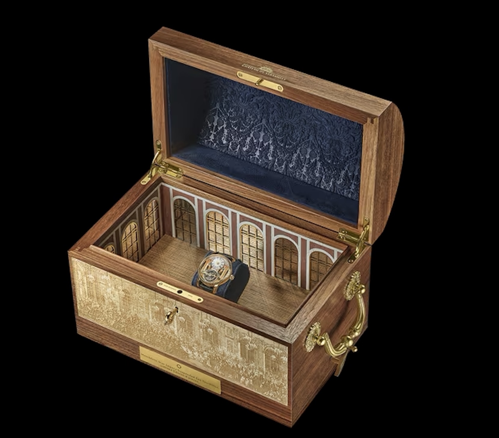 Le boîtier en or jaune Au 750/1000 (18 carats) est orné d'une couronne de laurier gravée à la main sur la lunette et d'une scène représentant Minerve et Mercure sur la carrure, reproduisant unepeinture du Salon de la Paix, une salle située à côté de la galerie des Glaces. Ce garde-temps est animé par le calibre de Manufacture MB M16.68 avec la complication brevetée Suspended Exo Tourbillon, qui a nécessité trois ans de développement. Le bracelet interchangeable encuir de veau gris imprimé alligator et le fermoir triple déployant en or jaune Au 750/1000 (18 carats) complètent ce garde-temps exceptionnel. Limitée à 8 exemplaires, la Montblanc Star Legacy Exo TourbillonChâteau de Versailles : « Le Secret du Bal des Ifs » est présentée dans un coffret en noyer contenant une boîte à musique jouant un air tiré d'une comédie-ballet de Jean-Philippe Rameau. Un spectacle enchanteur sur un parquet miniature entouré d'arcades en marbre,évoquant le bal masqué de Versailles dans la Galerie des Glaces.