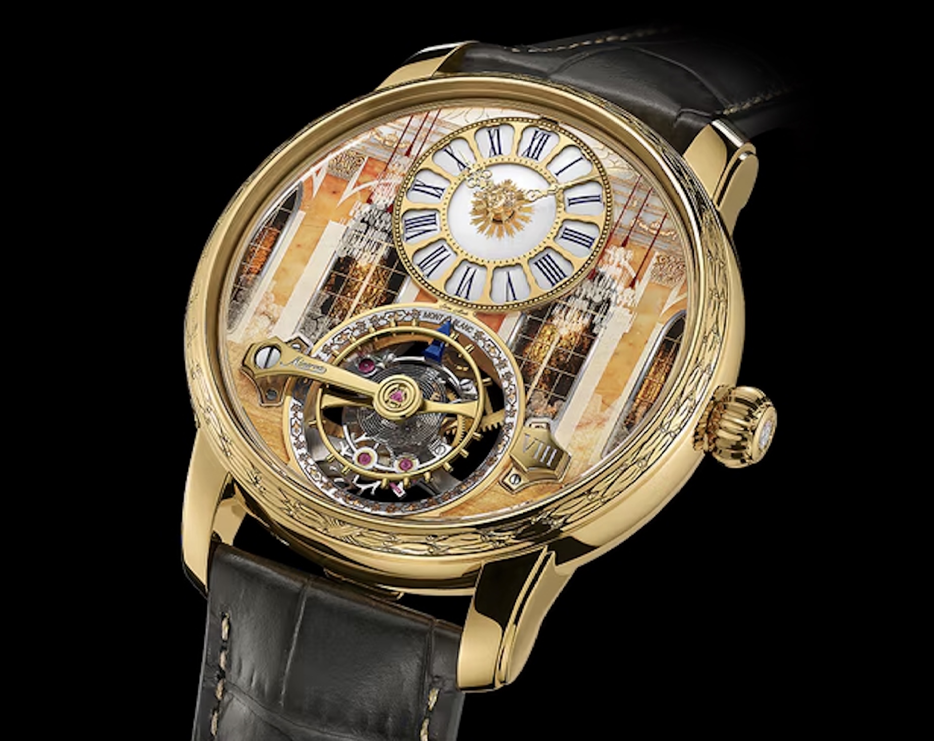 Recréez le grand bal masqué organisé en 1745 par Louis XV dans la célèbre galerie des Glaces de Versailles avec la Montblanc Star Legacy Suspended Exo Tourbillon Château de Versailles : « Le Secret du Bal des Ifs ». Cette montre exceptionnelle combine la haute horlogerie traditionnelle, la marqueterie, la gravure à la main et l'émail champlevé avec la modélisation numérique 3D et la gravure au laser. Le cadranprincipal reproduit le célèbre « Bal des Ifs », avec une base en or blanc Au 750/1000 (18 carats) recouverte d'émail noir et de paillons d'or, évoquant les reflets des lustres éclairés à la bougie dans les fenêtres de la galerie des Glaces. Les arches sont en pierre de Cacholong et en marbre de Sarrancolin, provenant de la même carrière des Hautes-Pyrénées que celle utilisée à Versailles. Le parquet est fidèlement reproduit en chêne massif. Les lustres et les invités en costume sontgravés sur une plaque de saphir superposée au cadran principal. Inspiré des montres de l'époque de Louis XIV, le cadran situé à 12 heures rappelle les traditions de la Haute Horlogerie avec son émail champlevé et son anneau gravé en or jaune Au 750/1000 (18 carats), tandis que les aiguilles squelettées en or jaune Au 750/1000 (18 carats) sont surmontées de la tête d'Apollon.